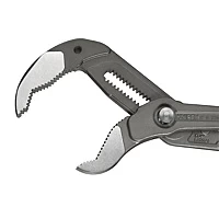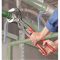 Knipex Waterpomptang Cobra 400mm bij GYZS.nl | Afname Per: 1 Stuk| Bewerking: Gepolijst | EAN: 4003773005636 | Gewicht (g): 1214 | Klembereik (mm): 9-95 | lengte (tang) (mm): 400 | Merk: Knipex | prijsfactor: 1 | Type: 87 01 400 | Uitvoering: Met Kunststof Bekleede Benen | Korte beschrijving: Pijp- en waterpomptang in één. Zelfklemmend op buizen en moeren: glijdt niet van het werkstuk af en werkt krachtbesparend. Snelle en precieze instelling, direct op het werkstuk. Geen onbedoelde verstelling mogelijk. Geen doorschieten van het scharnier. Fijnverstelling. Optimale hefboomwerking. In veel situaties als schroefsleutel inzetbaar. Grijpvlakken met speciaalgeharde tanden, hardheid van de tanden ca. 61 HRC: steeds weer veilig grijpen dankzij hoge slijtvastheid. Chroom-Vanadium elektrostaal, in olie gehard en getemperd Model: Grijpwijdte voor buizen tot 3 1/2″ met een lengte van een 1 1/2″-pijptang. 20% minder gewicht dan vergelijkbare pijptangen. Vestelbaar op 27 niveaus.