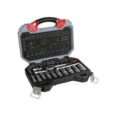 elektronica of instrumenten.Set dopsleutels met opbergkofferDeze 29-delige set van de meest gebruikte 3/8 inch dopsleutels zijn ontworpen voor precisie en duurzaamheid. De sleutels zijn gemaakt van gehard staal, waardoor ze bestand zijn tegen slijtage en corrosie. Ze zijn ideaal voor het werken aan voertuigen, machines of iets aan huis en kunnen gebruikt worden in garages, werkplaatsen of thuis. De set is voorzien van een stevige opbergkoffer waarmee de sleutels op een gemakkelijke en nette manier opgeborgen kunnen worden. Dit is een must-have set voor elke professional, klusser of hobbyist.Eigenschappen: Toolland 29-delige 3/8” dopsleutelset Quick-release ratelsleutel 72 tanden Cardangewricht 15x doppen: 8 – 22 mm 8x diepe doppen: 10, 11, 12, 13, 14, 15, 17, 19 mm 2x bougiedoppen: 16 en 21 mm 2x verlengstukken: 7.5 en 15cm Inclusief stevige opbergkoffer